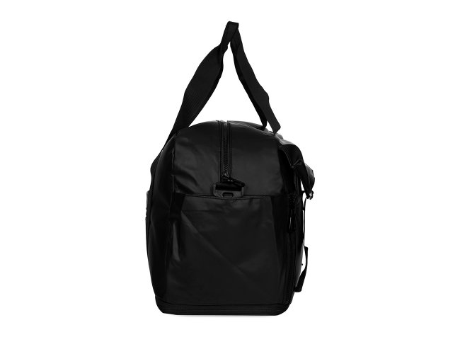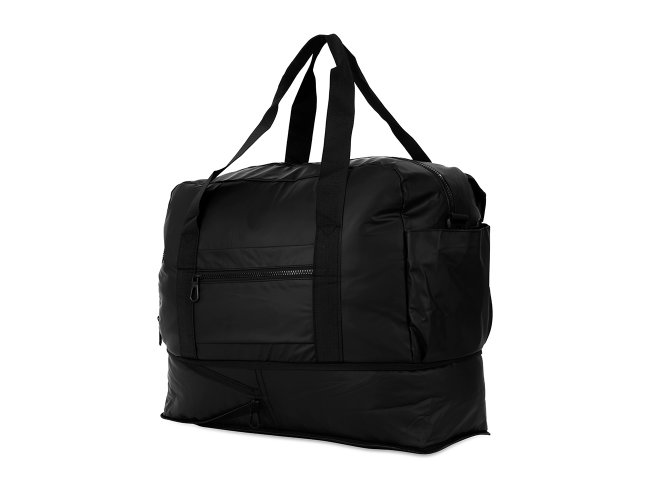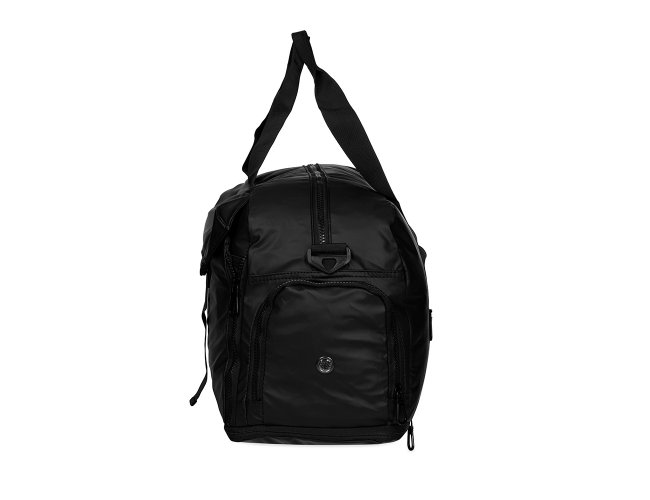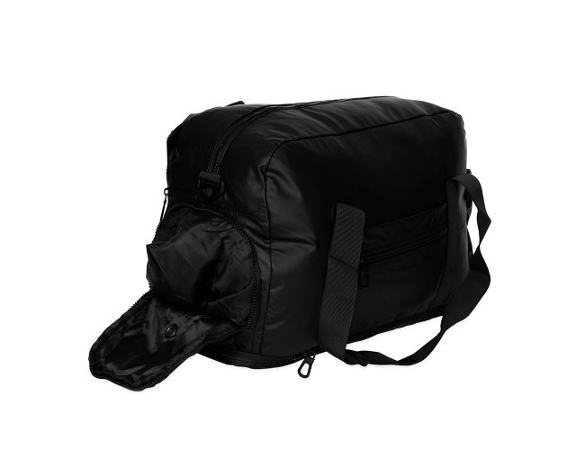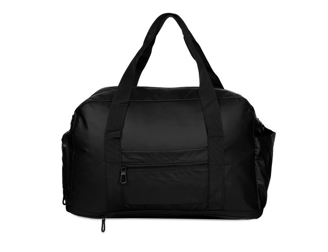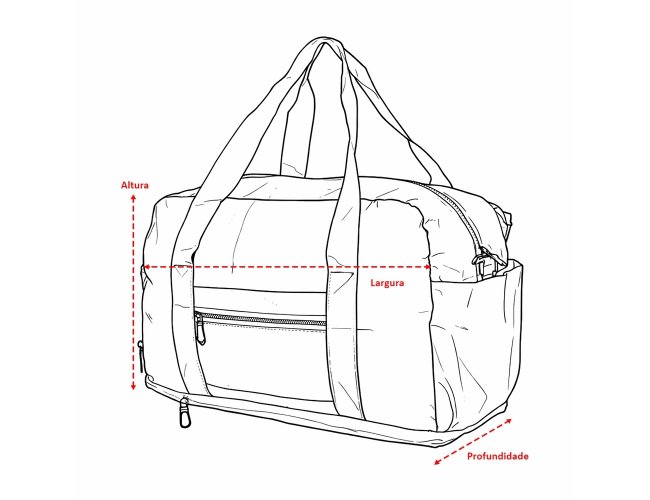 Bolsa impermeável confeccionada em couro sintético, fechamento em zíper e capacidade máxima de 36L quando o compartimento expansível está aberto. Possui compartimento com bolso para itens úmidos e compartimento lateral para tênis, um bolso aberto e outro, em tamanho menor e fechamento em zíper, com espaço posterior para encaixe em puxadores de malas, além de alças de mãos fixas em nylon. Acompanha alça transversal com apoio de ombro.