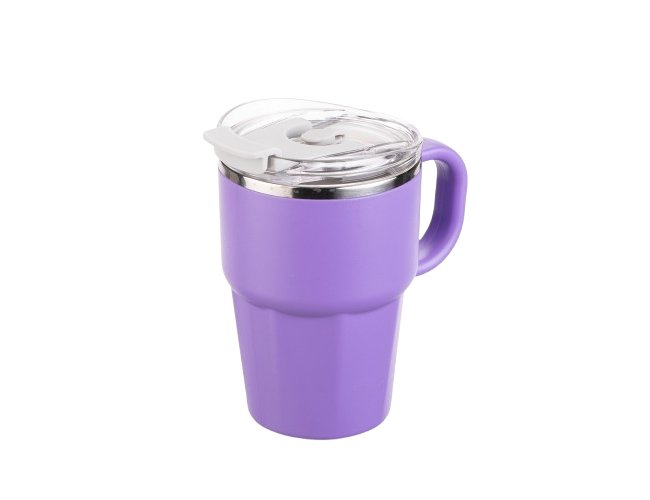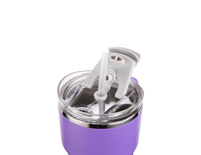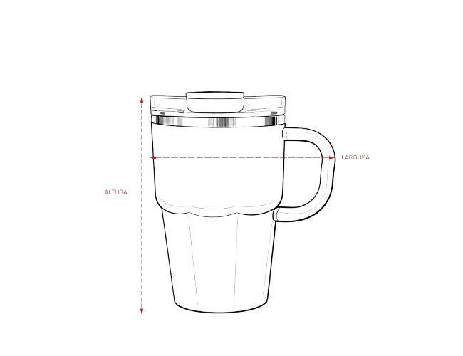 Caneca de parede dupla com interior em inox 304, revestimento externo e alça em plástico polipropileno (PP) e capacidade máxima de 550ml. Possui tampa de pressão em AS com protetor para o bocal em PP, além de acesso para canudo e anel de vedação em silicone, permitindo duas formas de consumo de bebidas. Acompanha canudo plástico.