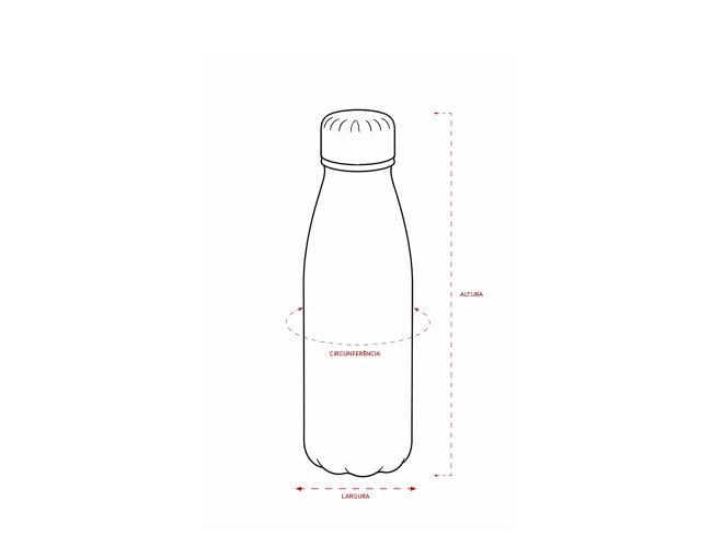 Garrafa em alumínio com tampa rosqueável e capacidade para até 550ml.