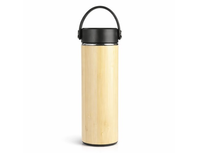 Garrafa térmica com capacidade máxima de 400ml. Possui estrutura de parede dupla com revestimento externo em bambu e parte interna em inox 304. Conta com tampa rosqueável em polipropileno (PP) com alça para transporte. Acompanha cesto infusor com alça em inox 304.